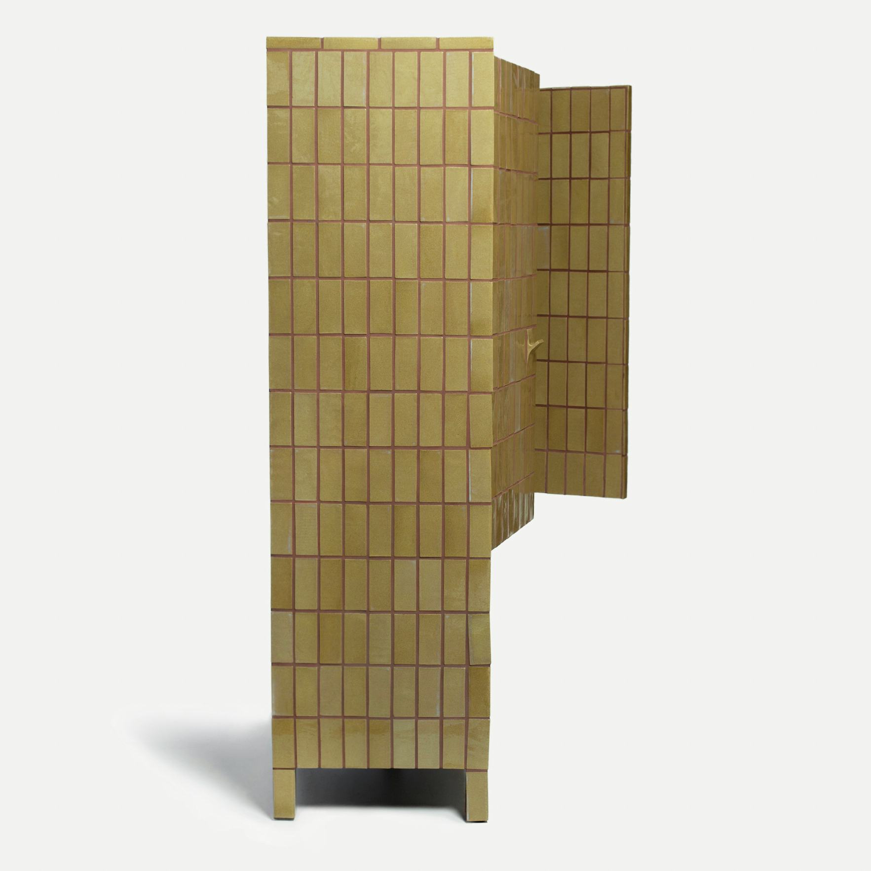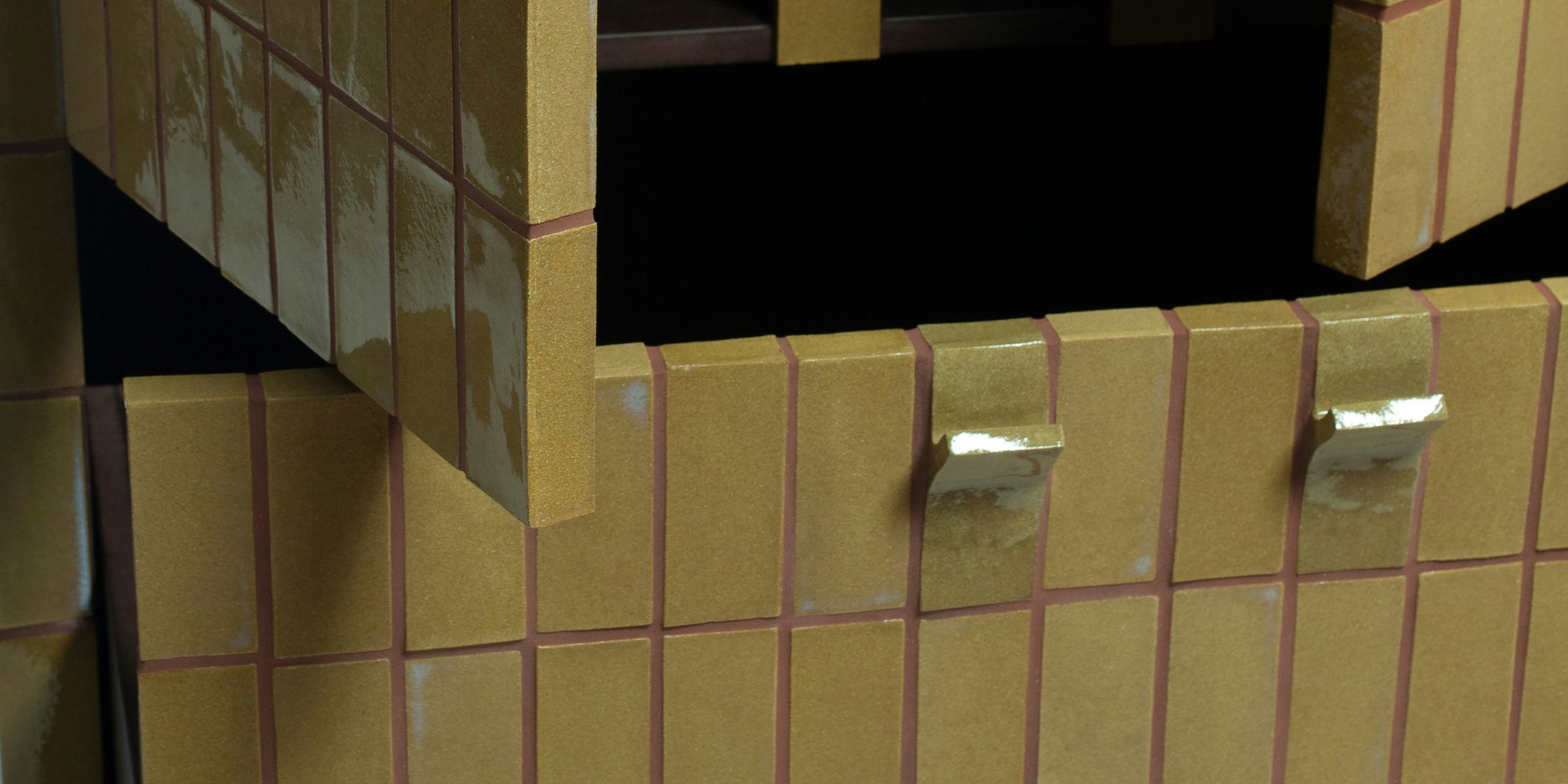 Matthew Raw’s Welcome Drinks Cabinet is a drawing room show-piece; a fully tile-clad bar unit which becomes a playful talking point for gathering round and celebrating. Raw crafts and lays each tile by hand having developed his distinctive glazes and tile-assembled furniture by drawing on historical tiled stations and buildings across London.