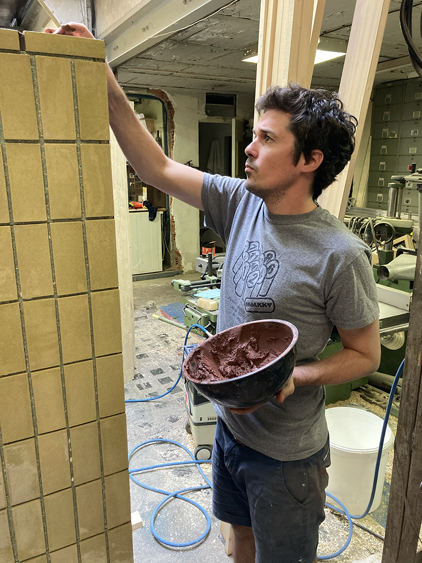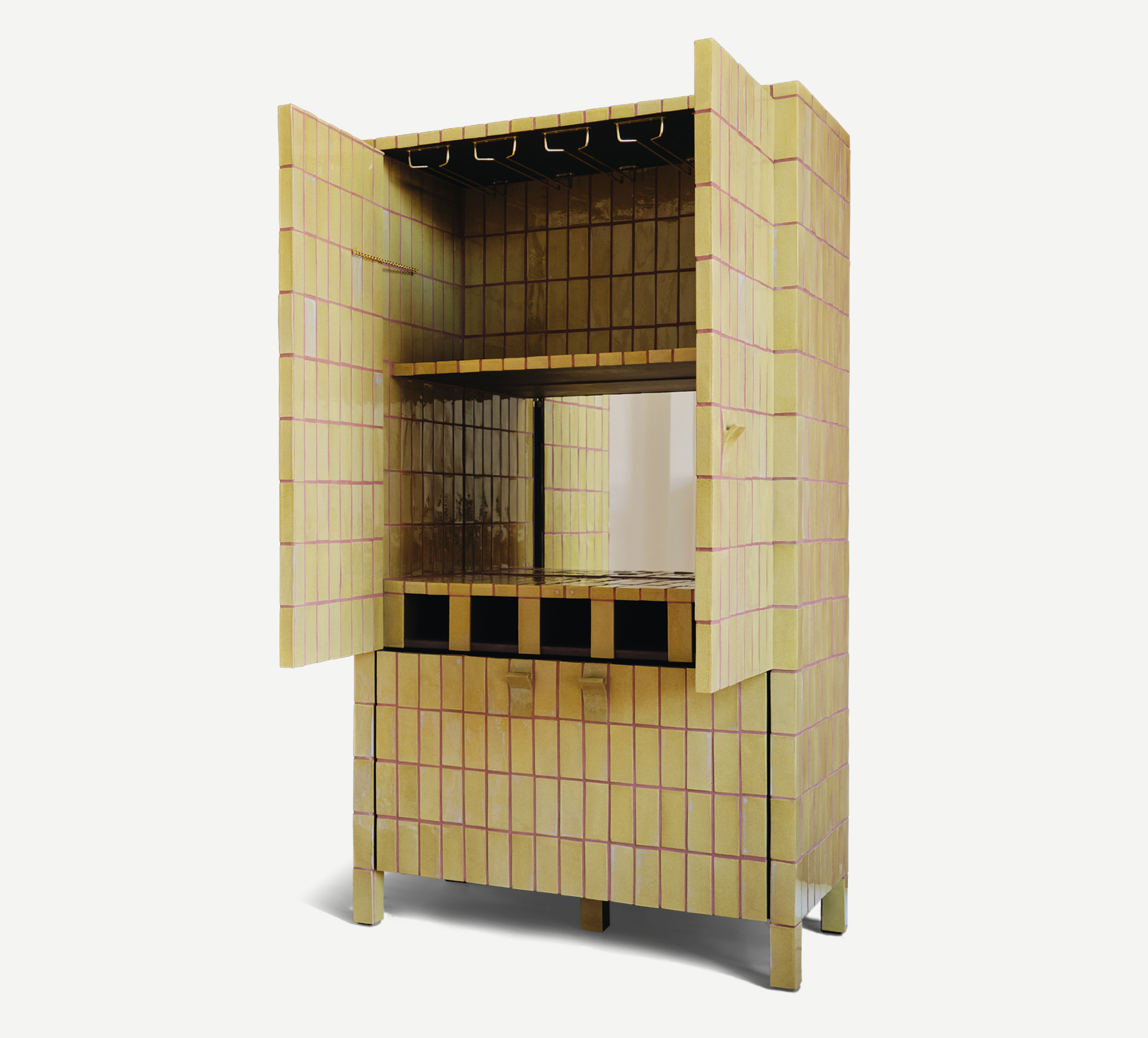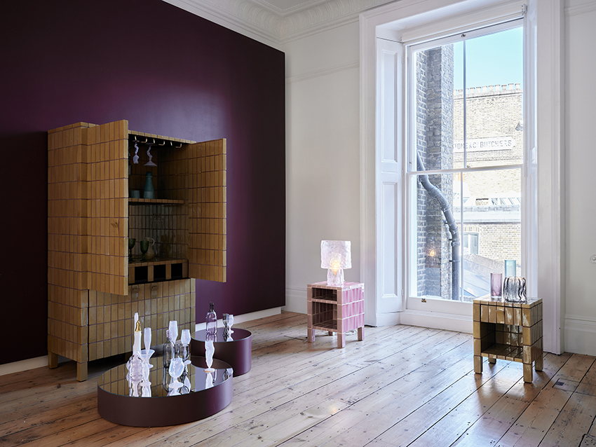 Matthew Raw’s Welcome Drinks Cabinet is a drawing room show-piece; a fully tile-clad bar unit which becomes a playful talking point for gathering round and celebrating. Raw crafts and lays each tile by hand having developed his distinctive glazes and tile-assembled furniture by drawing on historical tiled stations and buildings across London.