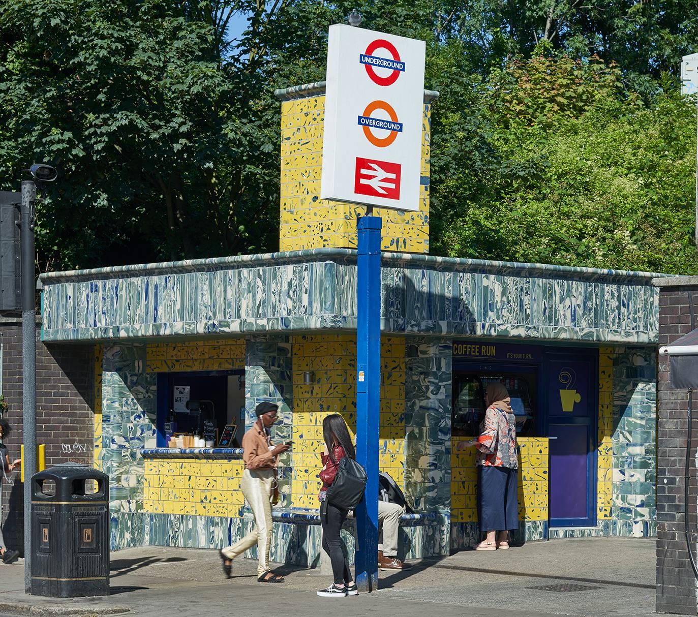 Collaboration with Assemble for commission by Art on the Underground. 1500+ hand-made tiles clad a kiosk at Seven Sisters Station, London